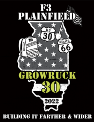 Established in July 2020, F3 Plainfield formerly known as F3 Crossroads (Illinois) has been taking advantage of this population boom and is a spark that has lit a fire for many Sad Clowns in the region. Sad Clowns that were at a crossroads in their own lives and are now invigorated to build the F3 reach farther and wider! Your participation in GrowRuck 30 will no doubt accelerate growth for the region, but will also enable us to reach out to more Sad Clowns who may be searching to change their lives for the better. We look forward to seeing you at GrowRuck 30…so come Get Your Kicks on Route 66!